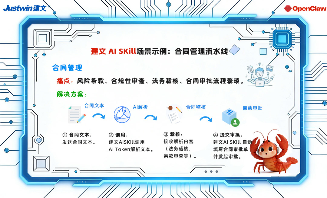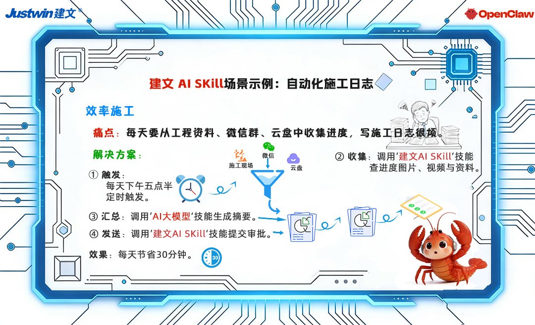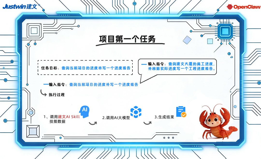 通过 OpenClaw 的JW AI Skill操纵建文工程项目管理软件,它能将原本需要数小时的手工填报,压缩为秒级自动化操作;能自动化在建文系统后台填报、关联信息、推送审批或同步提醒。