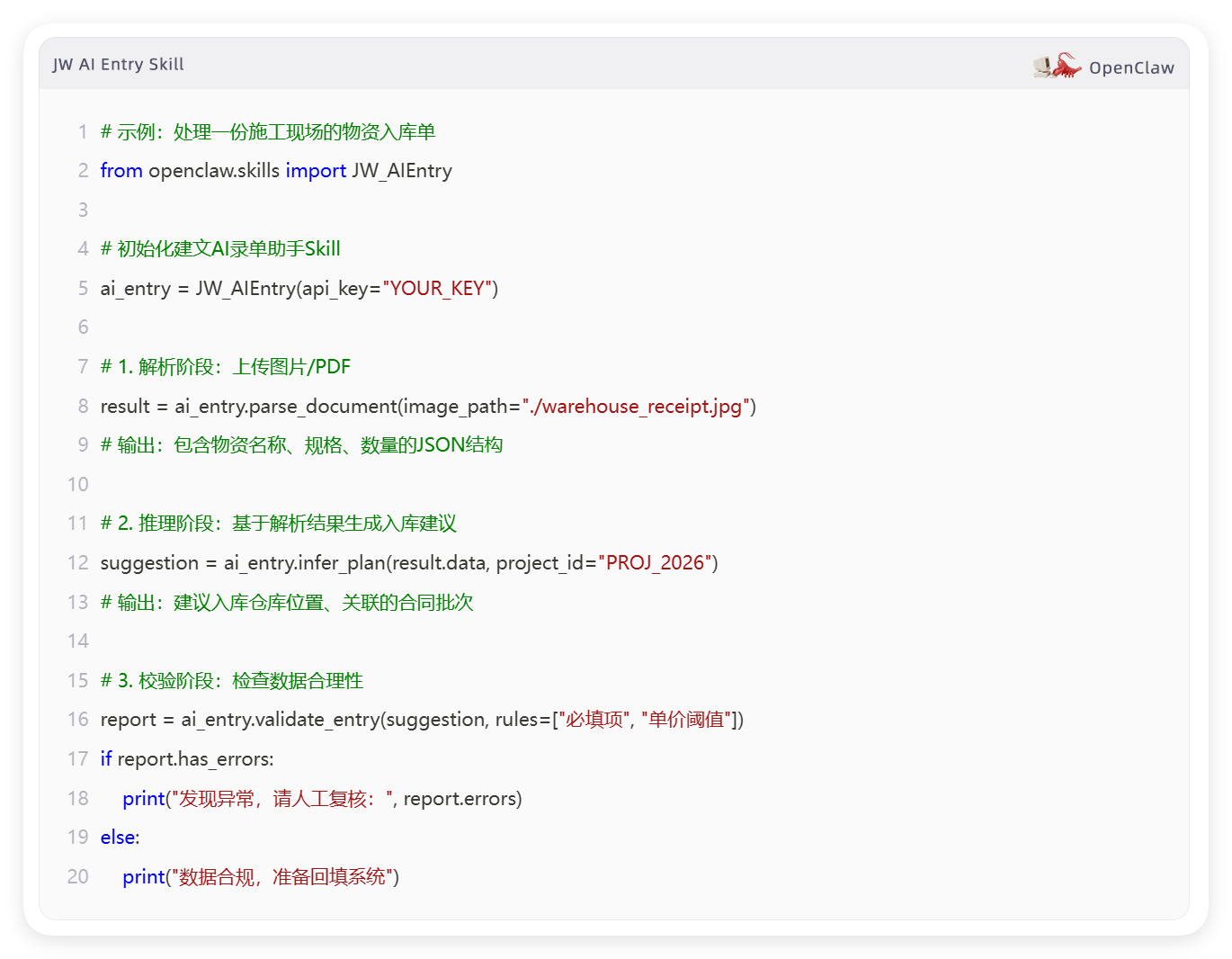 如果您正在使用OpenClaw框架与建文工程项目管理软件的应用,只需几行代码即可激活此录单Skill: